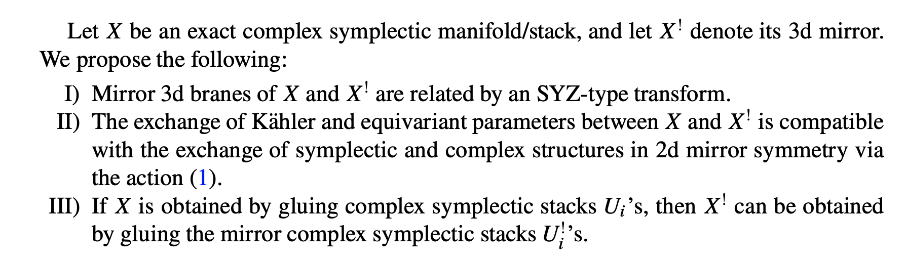 - Symp space: $X = [\mathcal{X} / / G_\C]$, where hol'c symp $\mathcal{X}$ is a $G_\C$-Ham space, and we do holc Ham reduction.
